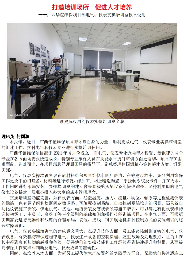廣西華誼維保項(xiàng)目部電氣、儀表實(shí)操培訓(xùn)室投入使用