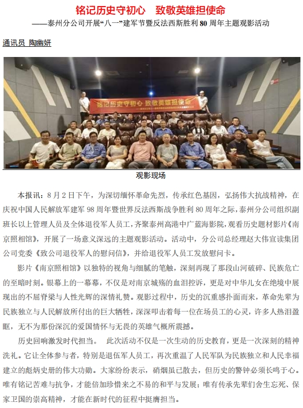 泰州分公司開展“八一”建軍節(jié)暨反法西斯勝利80周年主題觀影活動