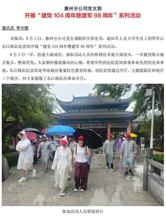 惠州分公司黨支部開展“建黨104周年暨建軍98周年”系列活動(dòng)